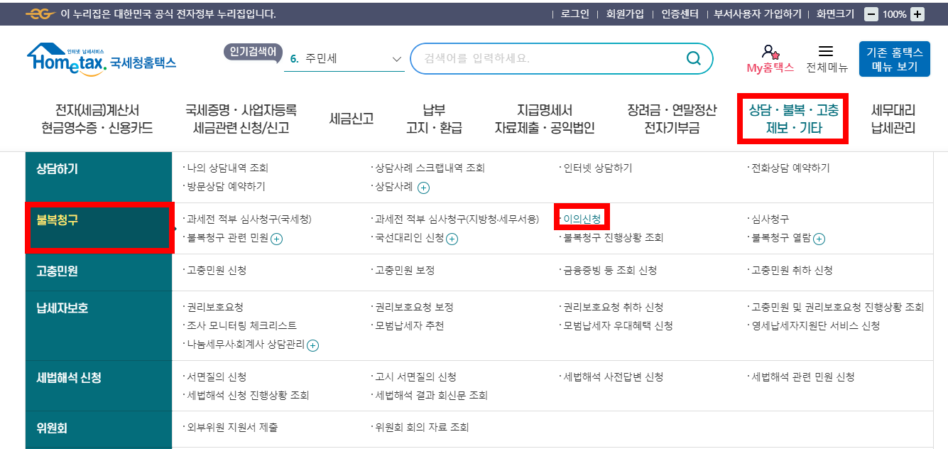상단 메뉴 중 상담·불복·고충제보·기타 > 불복 청구 > 이의신청을 클릭해주세요