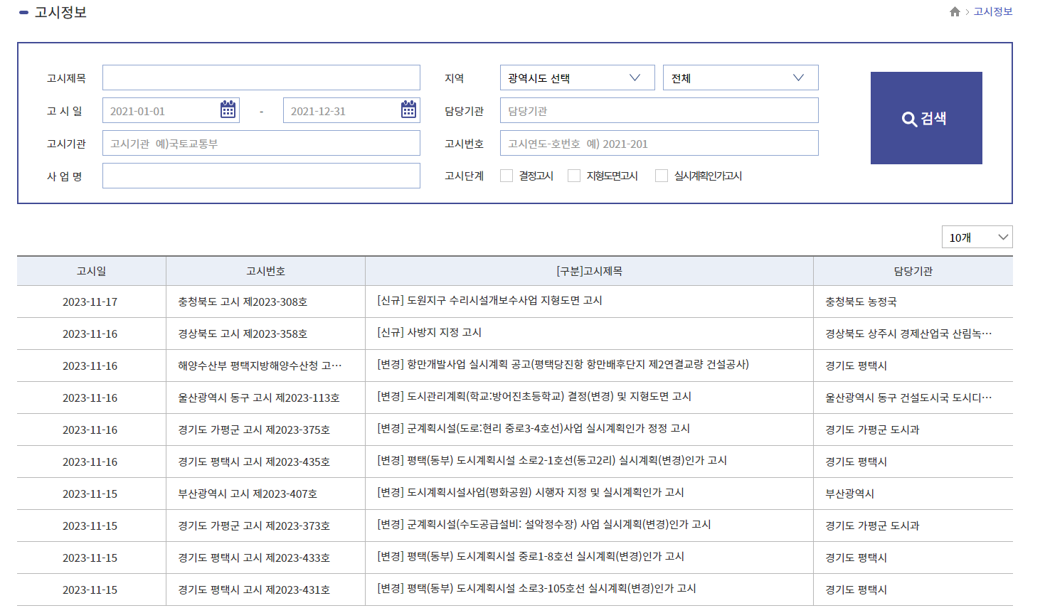 고지정보 메뉴에서는 새롭게 지정 및 변경되어 고시된 지역, 지구 등의 고시를 확인할 수 있습니다.