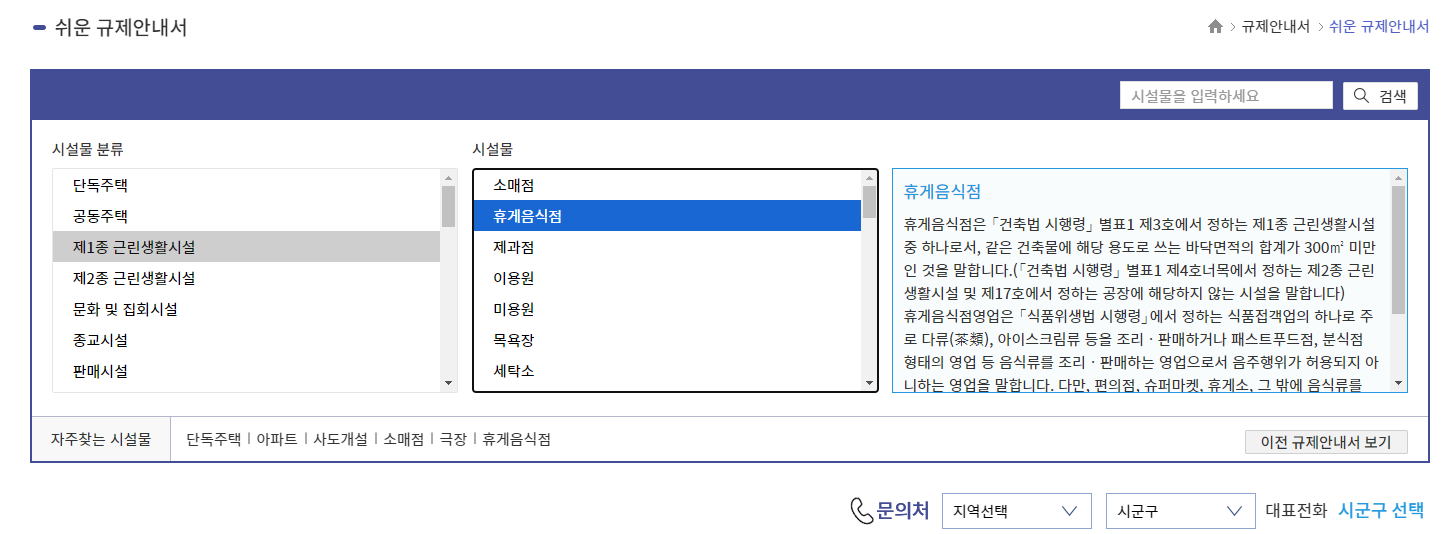 규제 안내서 메뉴에서는 건축물 건축 등을 위해 살펴 볼 인허가 기준, 절차, 서류 등을 확인할 수 있습니다. 예를 들어, 단독주택, 소매점, 다세대 주택, 휴게 음식점, 일반 음식점, 창고, 공장, 주차장, 어린이집, 학원 및 교습소 등의 건출물에 대한 인허가 사례를 쉽게 확인할 수 있습니다.