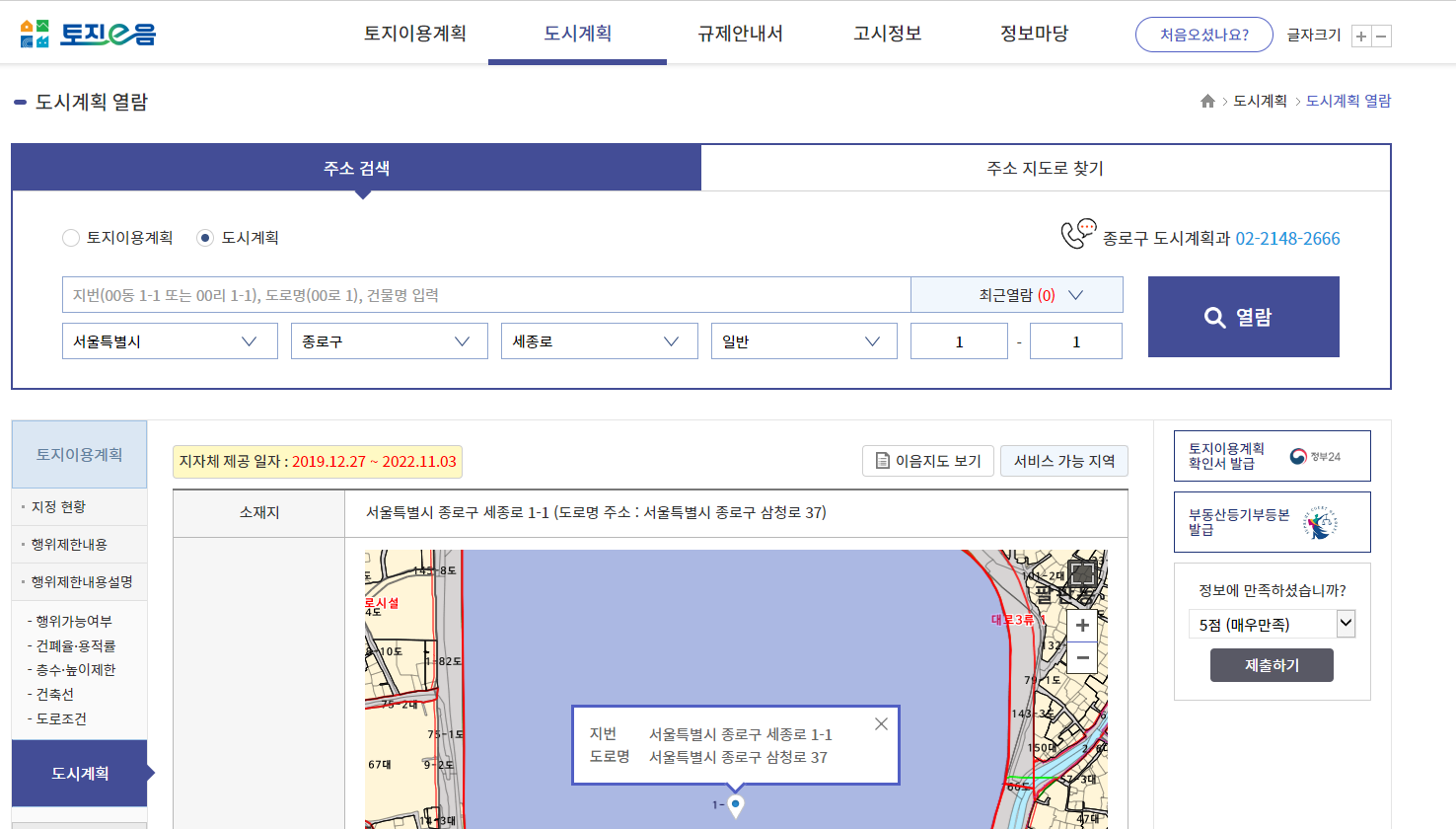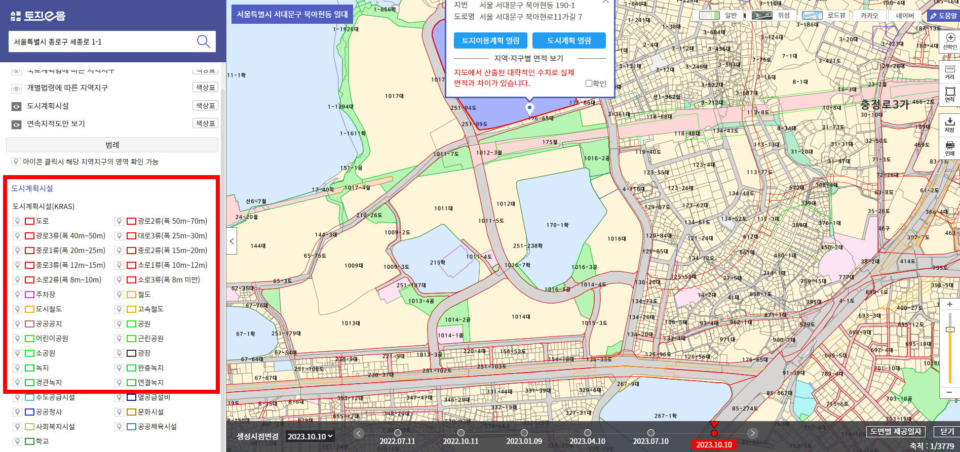 토지 이용 계획 메뉴에서 필지별로 지역 지구의 지정여부와 행위제한 내용 등을 실시간으로 확인할 수 있습니다. 예를 들어, 어떤 토지가 녹지 보전지역에 속하는지, 건축물을 건출할 수 있는지, 어떤 인허가 절차가 필요한지 등에 대한 정보를 얻을 수 있습니다.