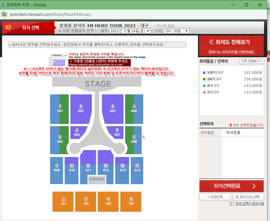 2023 임영웅 IM HERO 콘서트 티켓 가격은 VIP - 16,5000원, SR석 154,000원, R석 143,000원, S석 121,000원 입니다.
