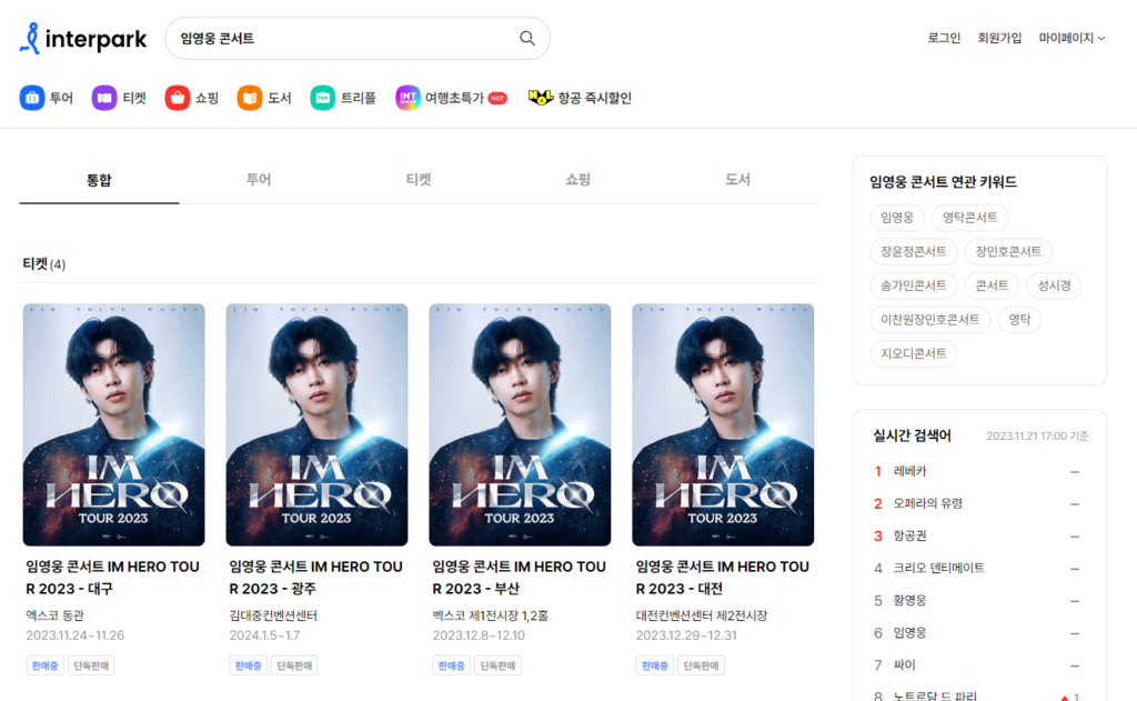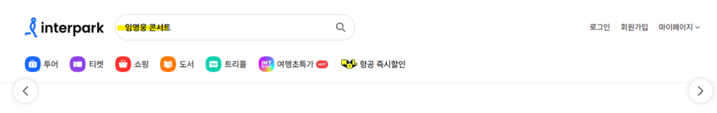인터파크에 접속해서 검색 창에 '임영웅 콘서트'를 검색합니다.