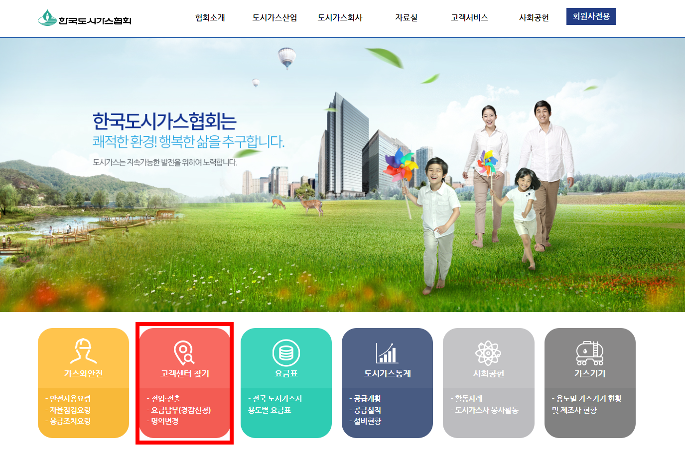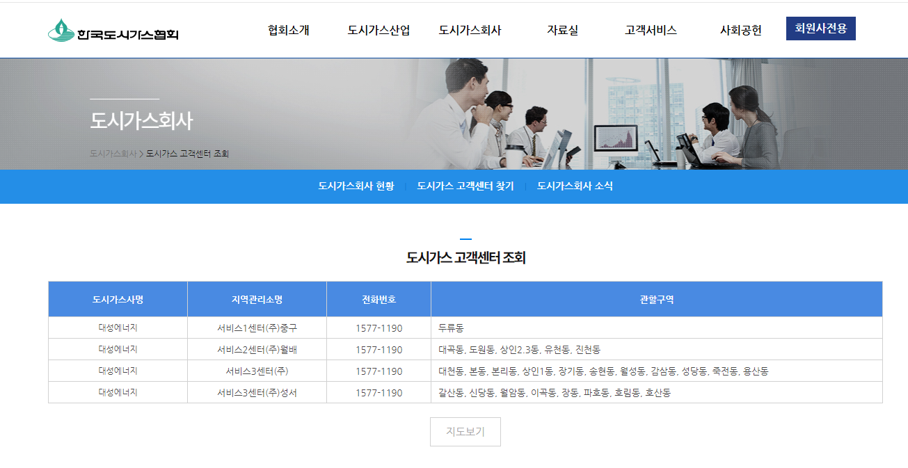 한국도시가스협회 홈페이지에 들어갑니다. 고객센터 찾기 메뉴를 클릭해주세요.