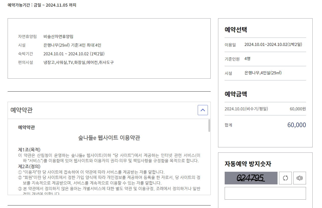 10월 1일 은행나무를 예약해보겠습니다. 확인을 누르면 아래와 같은 예약창으로 넘어갑니다.