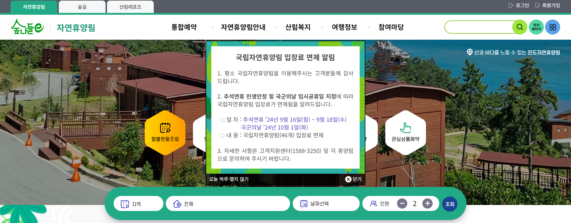 오늘은 포스팅을 통해 국립자연휴양림의 예약방법과 이용 시 알아두면 좋은 사항들을 소개해드리겠습니다.