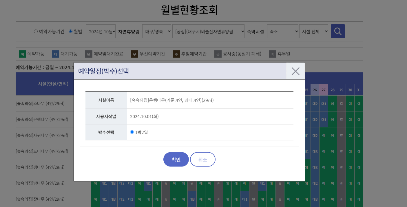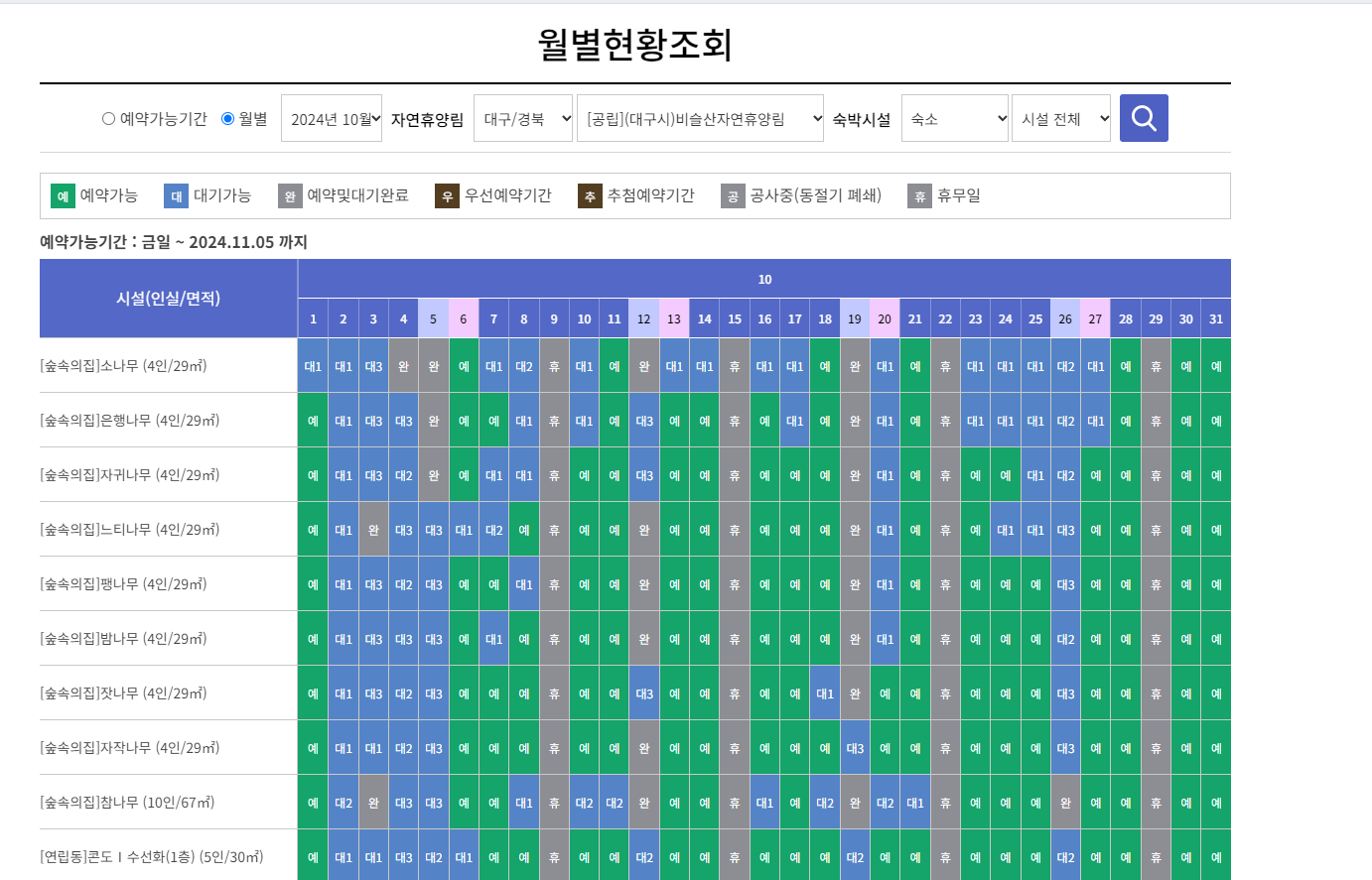 평일은 예약 가능한 기간이 많은 반면 10월 연휴 기간에는 대1, 대2, 대3 식으로 예약대기 까지 걸려있는 상태임을 확인할 수 있습니다.