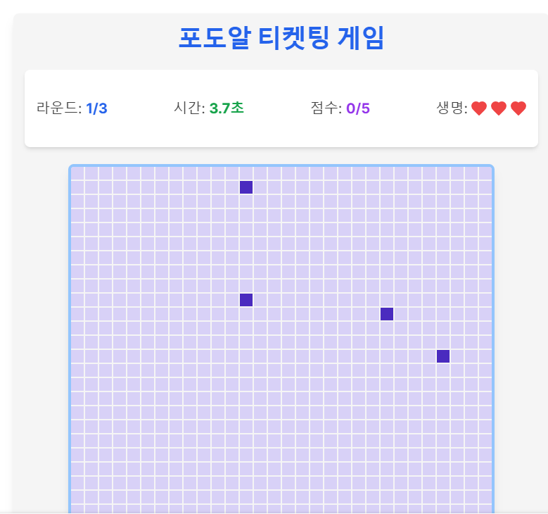 - '게임시작' 버튼을 클릭하여 포도알 티케팅 연습을 시작합니다.