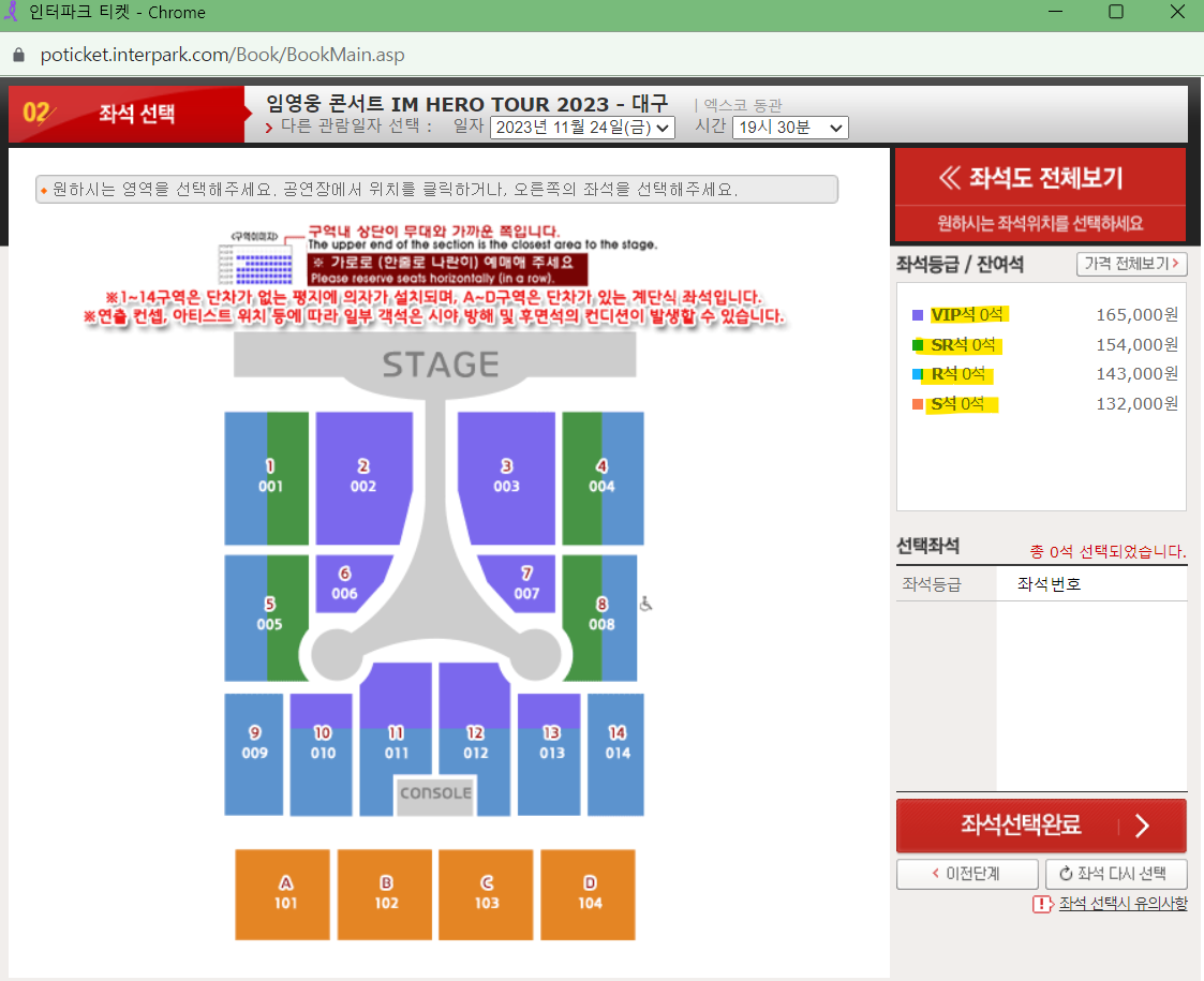 7. 인터파크에 들어가 수시로 확인을 하다 운이 좋아 잔여석이 0이 아닌 1 또는 2가 뜬다면 최대한 빨리 클릭을 해서 좌석을 선택한 뒤 결제를 하시면 됩니다.