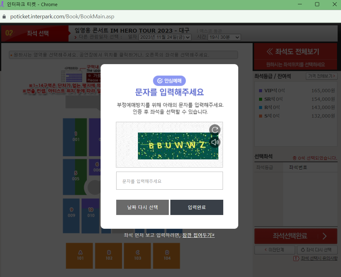 5. 부정 예매 방지를 위한 안심 문자 입력을 하라고 뜰텐데 해당 알파벳을 차례로 입력해주시면 됩니다. 대문자로 뜬다면 대문자를 지켜주셔야 합니다.