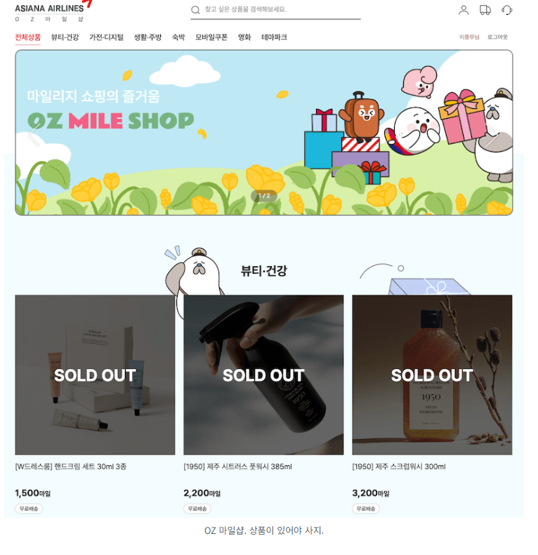 OZ마일샵은 마일리지로 구입할 수 있는 곳이지만 현재 재고 부족으로 실질적인 구입이 어렵습니다.