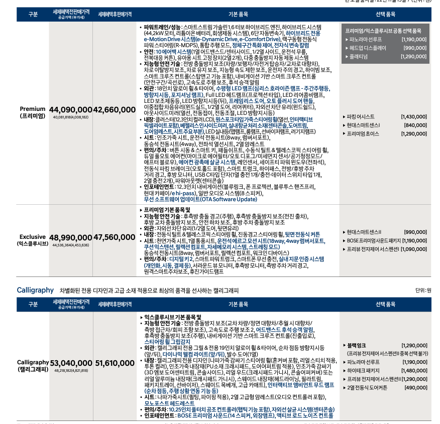프리미엄 등급은 4400만원 정도 하나 친환경 세제 혜택을 고려하면 4266만원 이라고 보시면 되겠습니다. 익스클루시브 등급은 4899만원인데 친환경 세제 혜택을 받으면 4756만원. 캘리그라피 등급은 5300만원인데 친환경 세제 혜택을 받으면 5161만원에 구입할 수 있습니다.