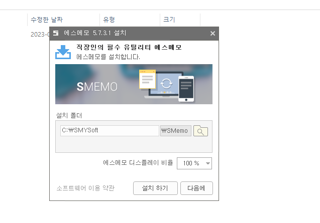 S메모 공식 사이트에 접속해서 PC 다운로드 버튼을 눌러 파일을 다운 받습니다.