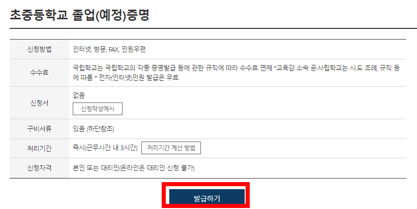 초중등학교 졸업(예정)증명으로 이동을 한 것을 확인할 수 있습니다. 이때 중앙에 발급하기를 눌러주세요.
