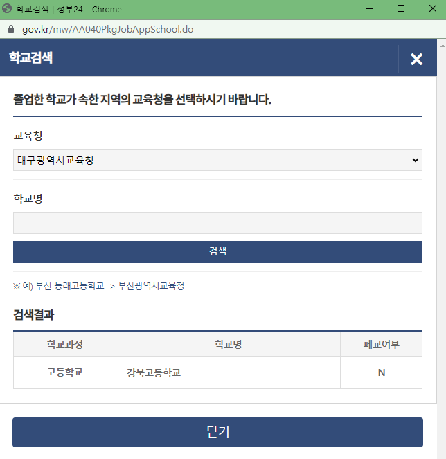 이렇게 졸업한 모교의 해당 교육청과 학교명을 정확하게 입력을 해주시면 검색결과에 뜨는 것을 볼 수 있습니다. 검색결과를 클릭해줍니다.