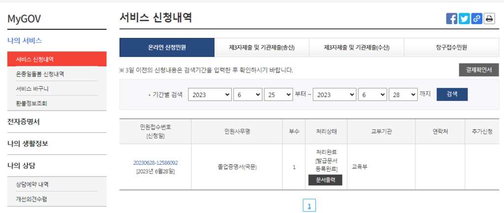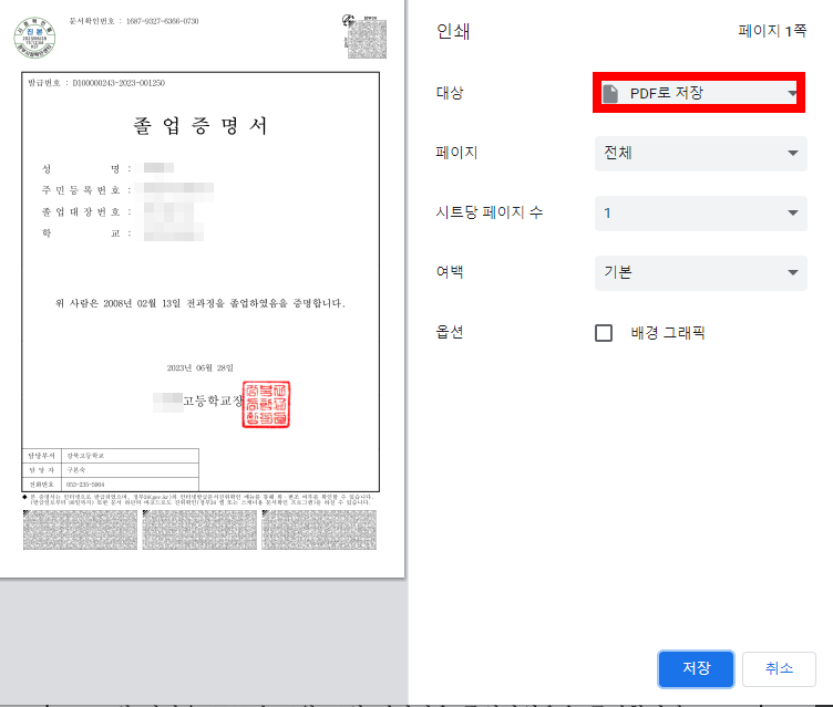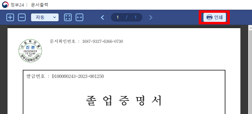 나의 서비스(My Gov) 서비스 신청내역에 들어가면 졸업증명서(국문)을 출력할 수 있습니다. 프린트가 없거나 pdf 파일이 필요한 경우 pdf 파일로 저장하기를 누르면 됩니다.