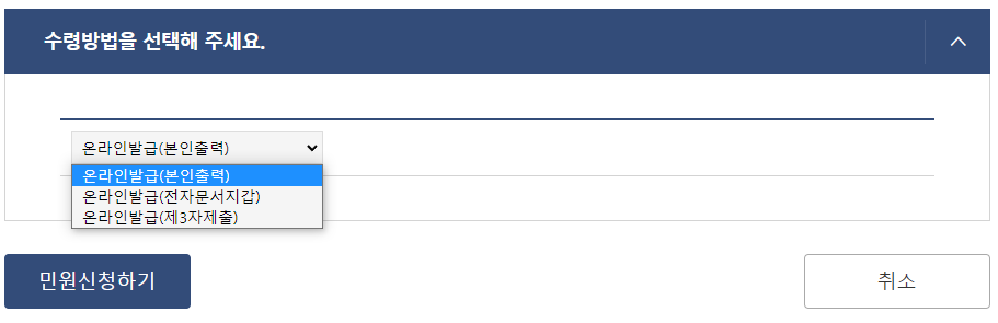 수령 방법에는 총 3가지가 있습니다. 본인출력, 전자문서지갑, 제3자제출이 있는데 저는 온라인 발급(본인출력)으로 민원신청을 마치겠습니다.
