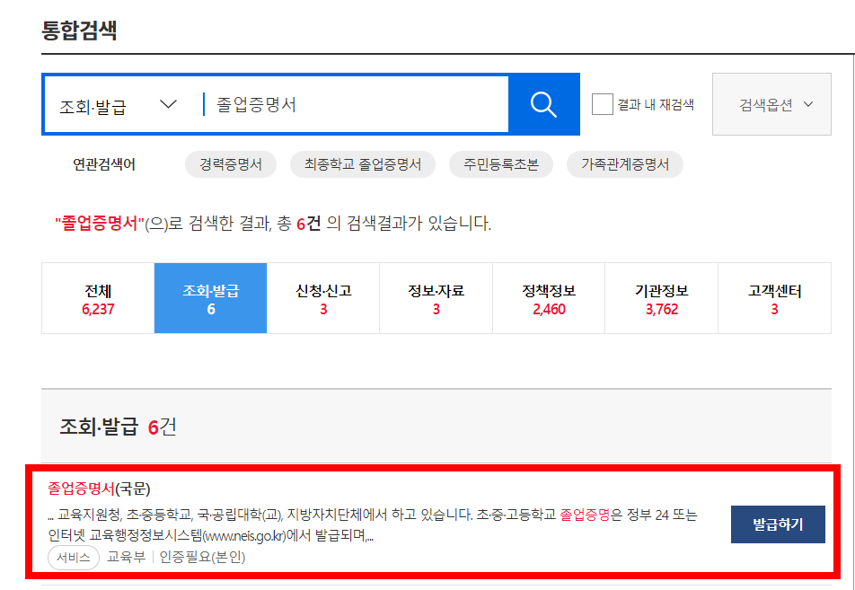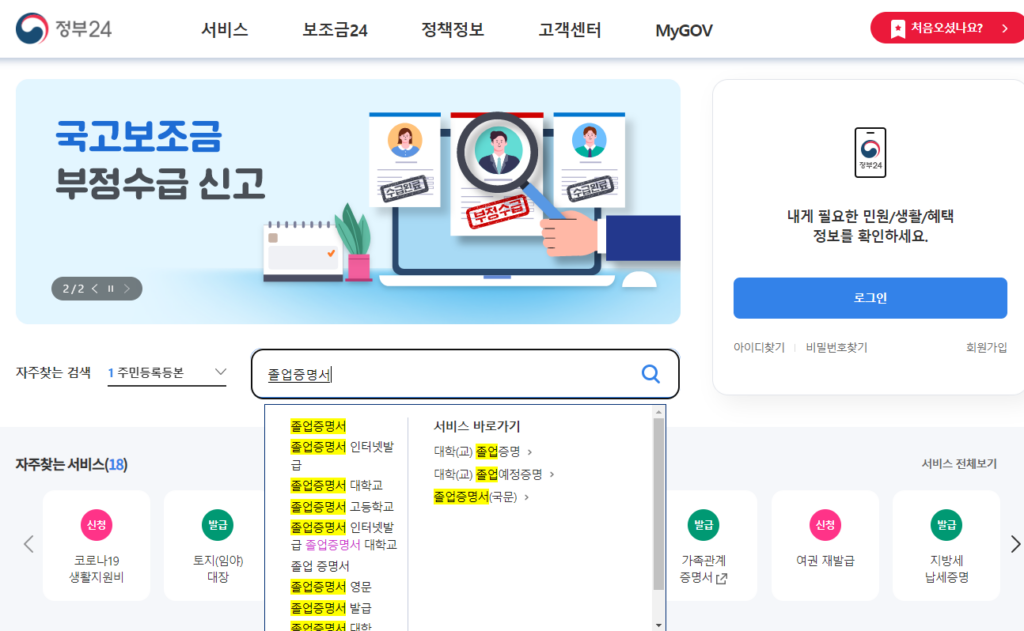 정부24에 접속해서 고등학교 졸업증명서 발급도 가능합니다. 졸업증명서 뿐만 아니라 생활기록부 발급 및 검정고시 성적증명서, 학위증명서 등도 발급이 가능합니다.
