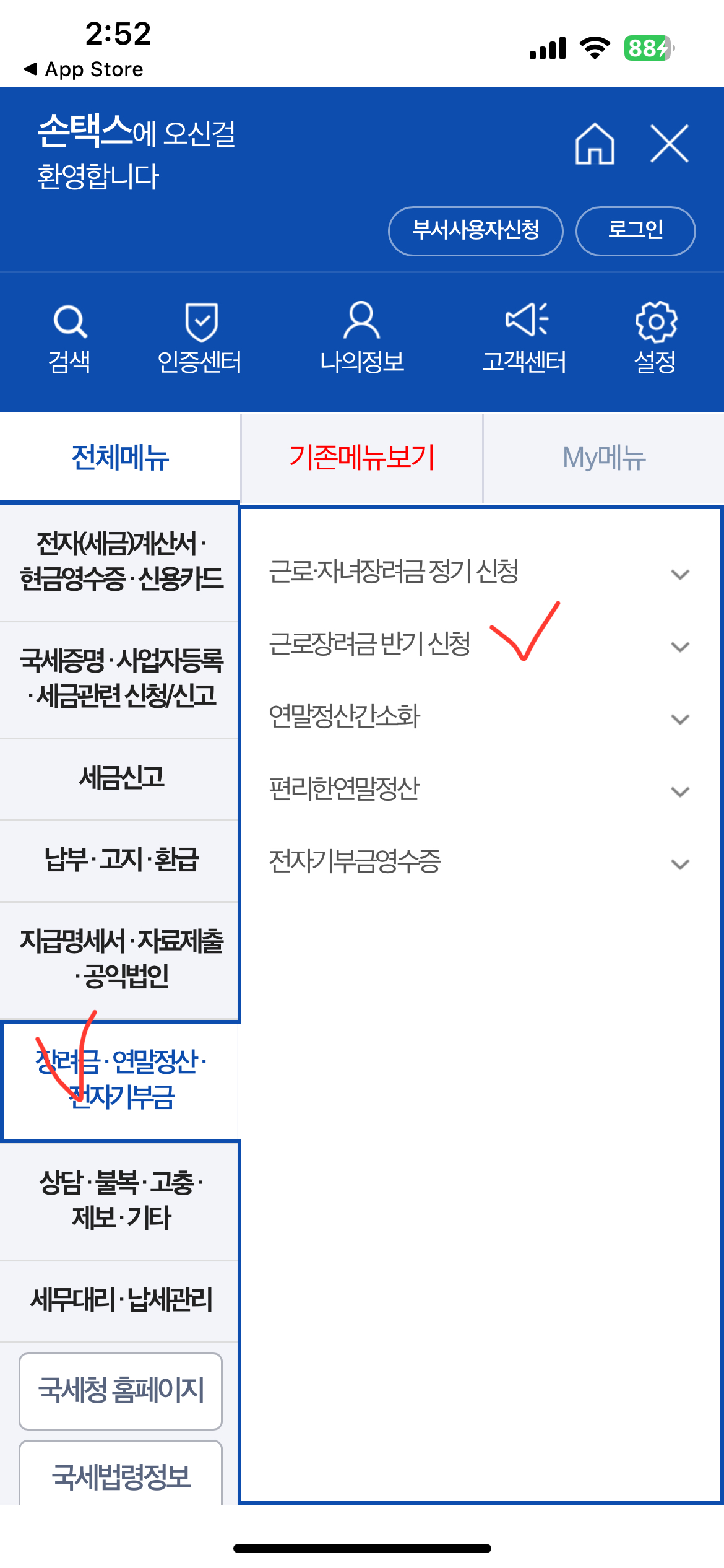 손택스 어플을 다운받은 뒤 실행해주세요. 그다음 우측 상단에 전체메뉴를 클릭하신 뒤 장려금 연말정산 전자기부금 메뉴를 클릭하신 뒤 근로장려금 반기 신청에 들어가서 심사진행조회를 하시면 됩니다.