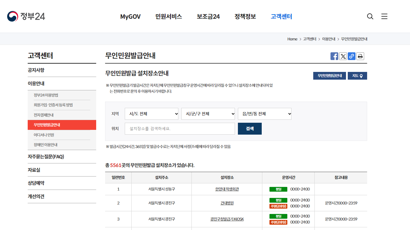 정부24 무인민원발급안내에 들어가면 내가 살고 있는 시/도 전체에 위치한 무인민원발급기의 위치도 알 수 있습니다.