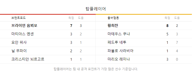 양팀의 탑플레이어를 살펴보면 황희찬 선수가 8골 2도움으로 양팀 통틀어 공격 포인트가 가장 많은 것을 볼 수 있습니다. 황희찬 선수의 활약을 기대하며 포스팅을 마치도록 하겠습니다.