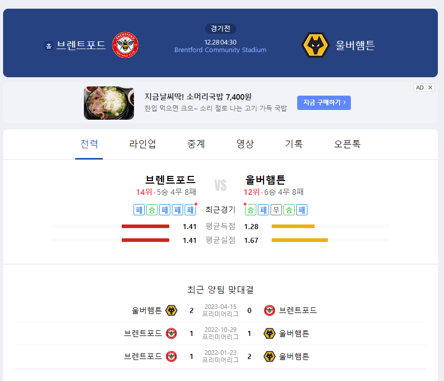 브렌트포드는 최근 5경기에서 1승 4패를 기록하고 있고 울버햄튼은 최근 5경기 2승 1무 2패를 기록하고 있습니다. 기세로만 보면 울버햄튼이 조금 더 우위에 있는 것 같습니다. 양팀 최근 맞대결 전적도 2승 1무로 울버햄튼이 앞서고 있네요.