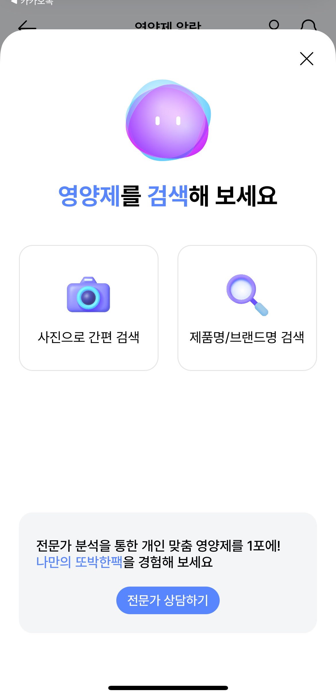 AI 알고리즘 분석을 통해 내 영양상태를 확인하고 필요한 영양성분을 추천해 주고 고쳐야 할 생활습관을 제안하고 영양제도 추천해 줍니다.