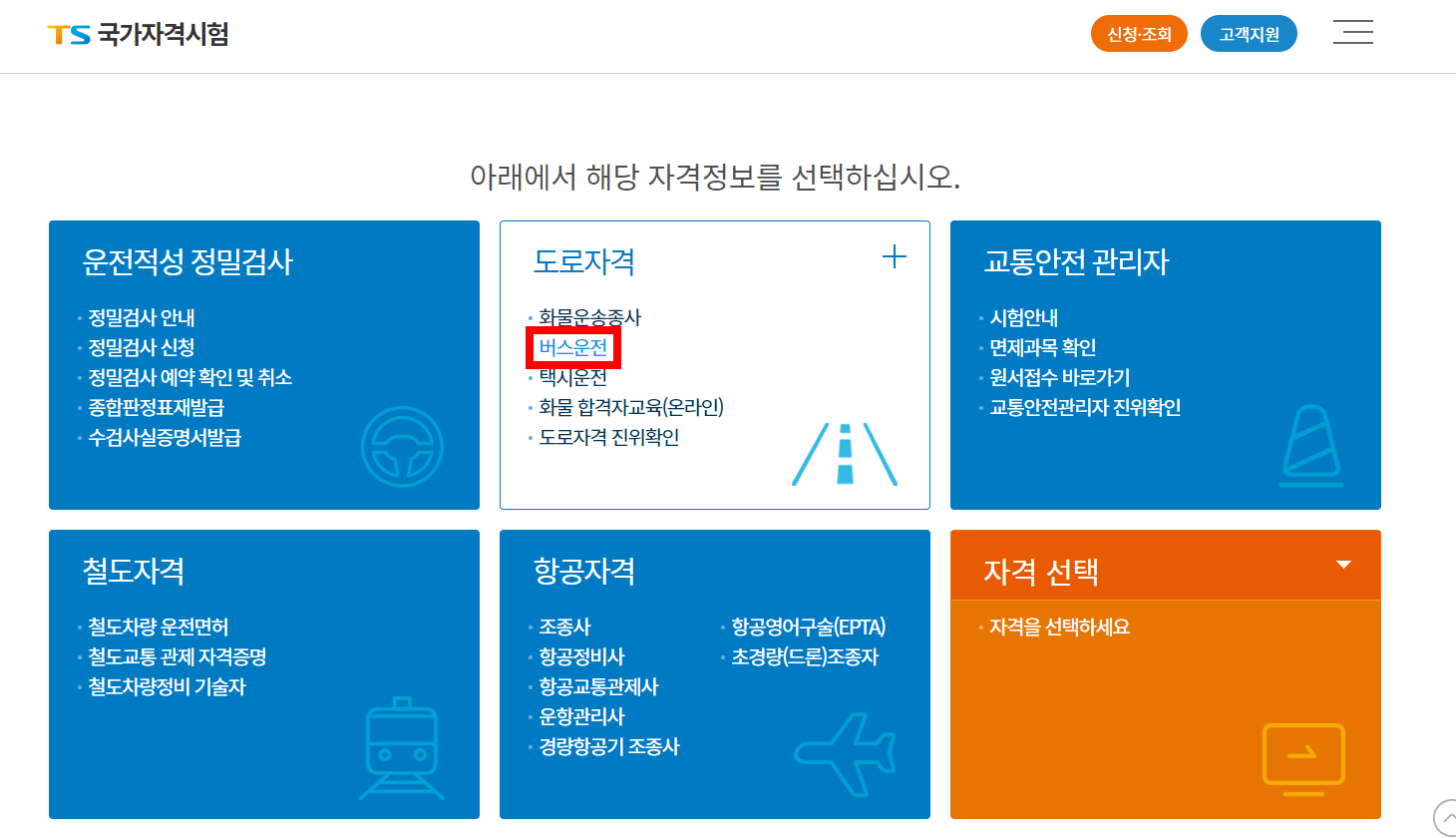 면허, 경력, 운전적성 정밀 검사를 모두 충족했다면 TS국가자격시험 도로자격 홈페이지를 통해 버스운전 자격시험에 응시할 수 있습니다.