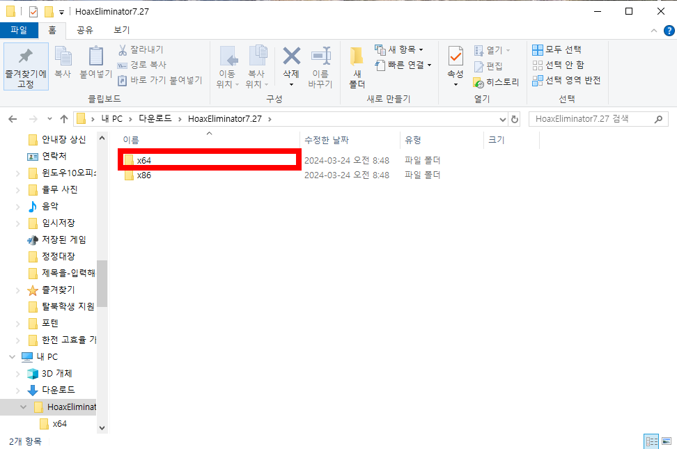 1️⃣ 다운로드한 압축파일을 풀어 '구라제거기' 압축이 풀리면 x64를 클릭합니다.