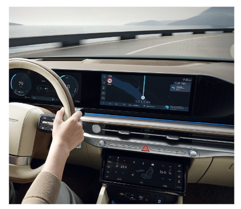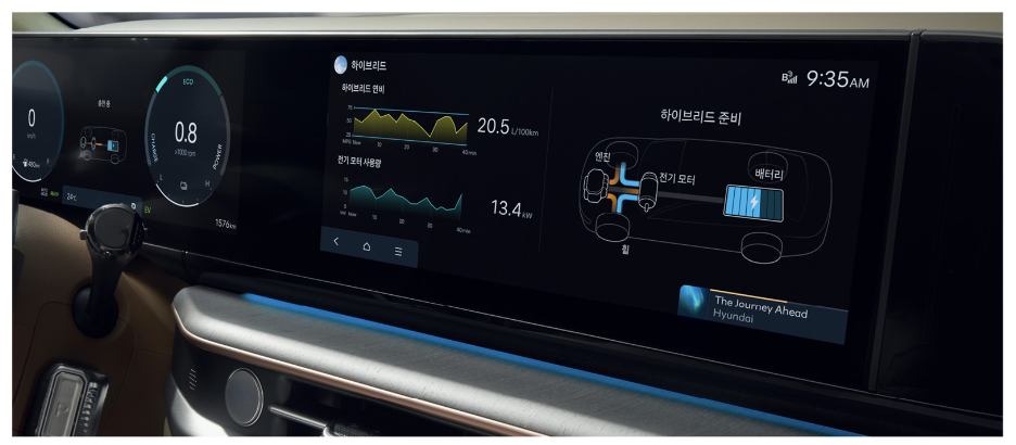 그랜저 하이브리드는 하이브리드 전용 컨텐츠를 제공합니다. 차량의 전기 모터 사용량, 하이브리드 연비 등 하이브리드 주행에 특화된 다양한 콘텐츠를 대쉬보드를 통해 제공받을 수 있습니다.