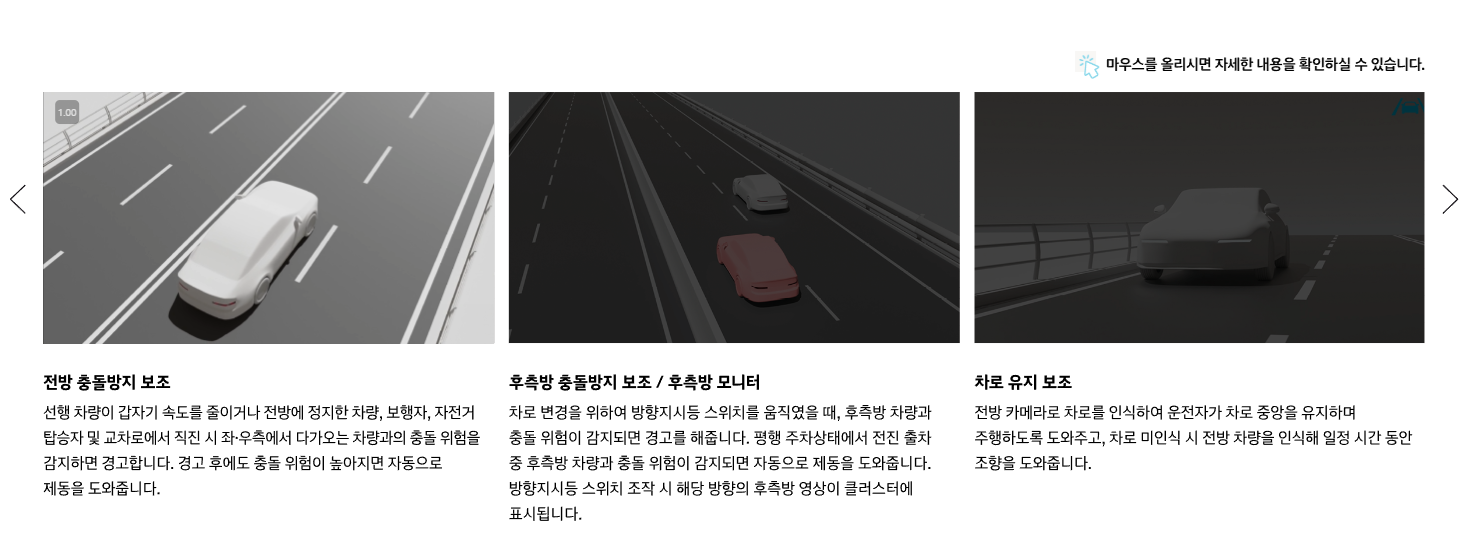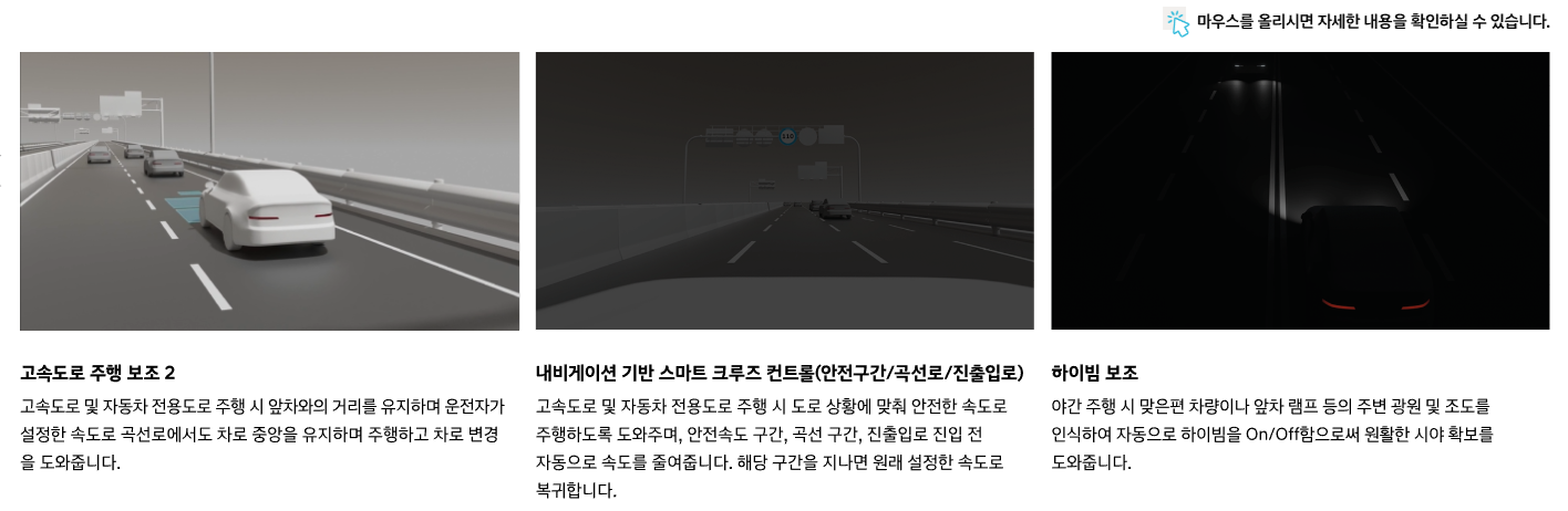 그밖에 스마트센스 시스템을 통해 전방 충돌방지 보조, 후측방 충돌방지 보조/ 후측방 모니터, 차로 유지 보조, 스마트 크루즈 컨트롤, 하이빔 보조 등의 편의 기능을 제공하여 운전자의 운전에 대한 피로도를 줄이고 편하게 운전할 수 있게 도와줍니다.
