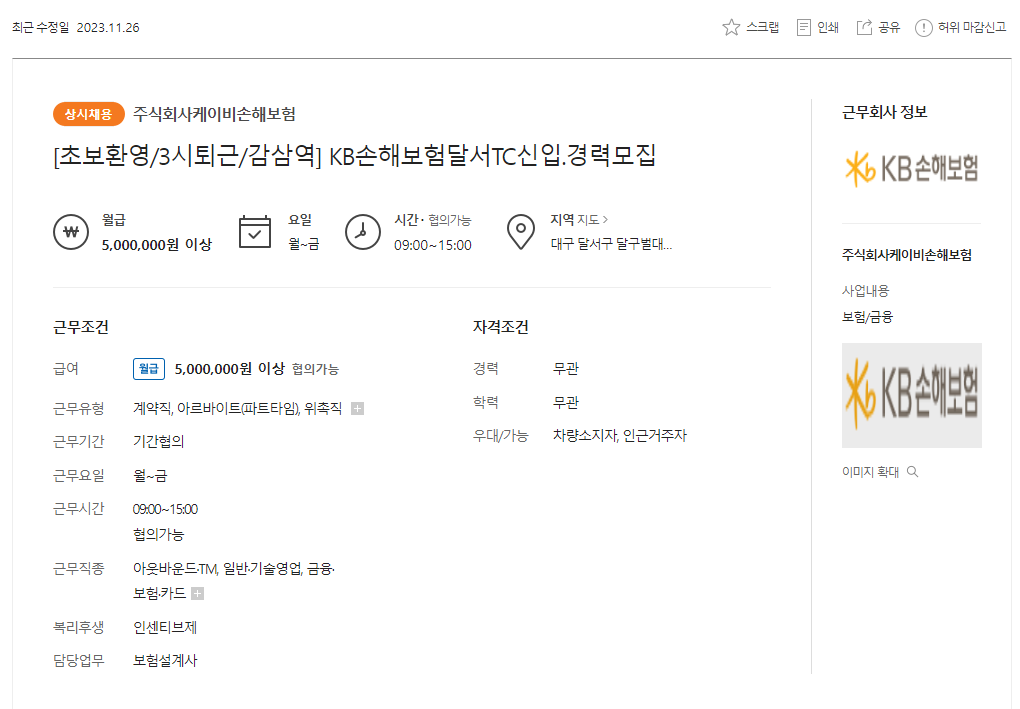 일반 채용정보에 나와있는 구인 구직 중 케이비 손해보험 달서 TC신입, 경력모집을 클릭해 보았습니다. 조금 더 자세한 내용을 확인할 수 있습니다.