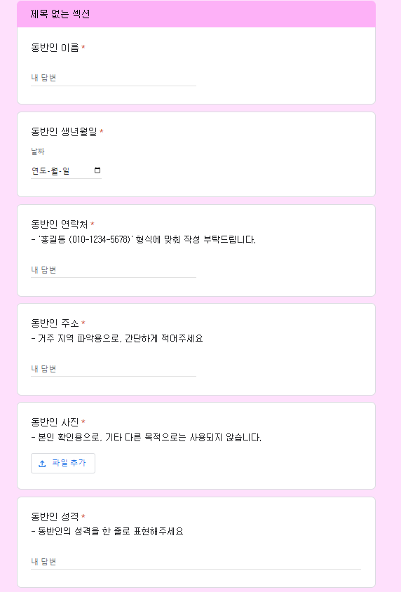 동반인 유무에 '유'를 체크하고 다음 버튼을 클릭하게 되면 동반인 정보를 입력하는 설문으로 넘어갑니다. 동반인의 이름과 생년월일, 연락처, 주소, 사진, 성격 등의 설문에 답변을 적어주세요!