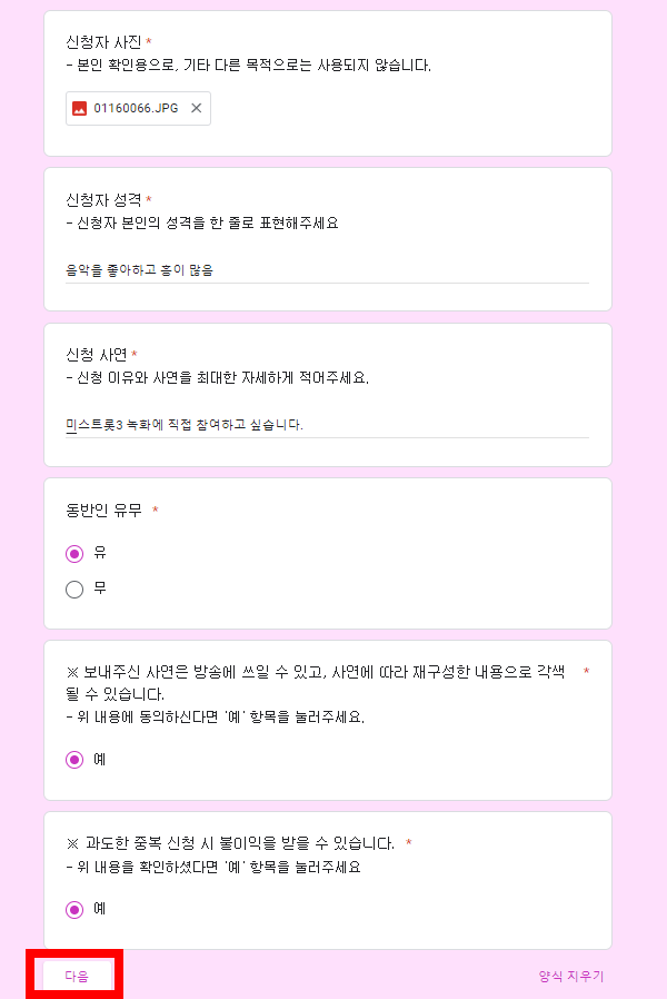스크롤을 아래로 내리면 체크리스트가 나옵니다. 신청자 이름, 신청자 성별, 신청자 생년월일, 신청자 연락처, 신청자 주소, 신청자의 사진, 성격, 사연, 동반인 유무 등의 답변에 답변을 하셔야 합니다.