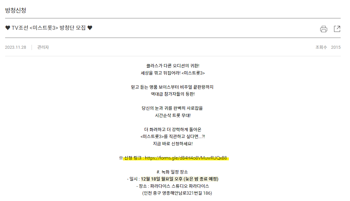 먼저 아래 바로 가기를 클릭해서 TV조선 미스트롯3 공식 홈페이지 방청단 신청 게시판으로 이동을 해주세요.