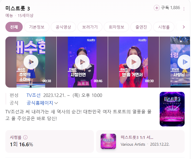 미스트롯3 첫방송 시청률은 16.6%를 기록했습니다. 트롯 열풍이 시들해져 가는게 아닌가? 하는 생각을 했었는데 미스트롯3 첫방송 시청률을 보니 트롯 열풍은 식지 않은 것 같네요.