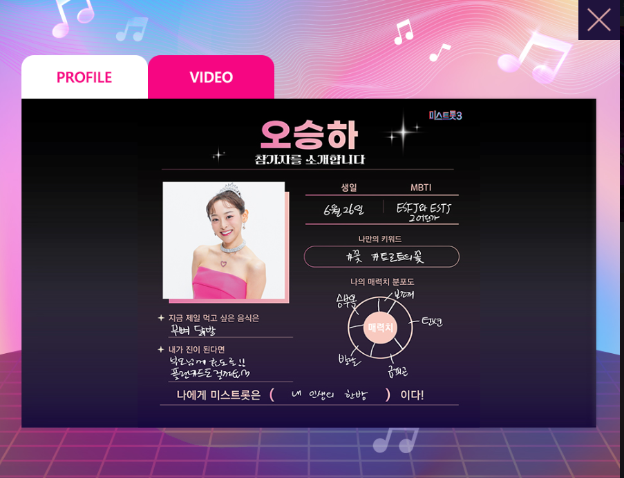 참가자들의 자세한 프로필과 1분 영상이 궁금하시면 미스트롯3 공식 홈페이지에 접속하셔서 출연자의 사진을 클릭하면 프로필과 영상을 보실 수 있습니다.