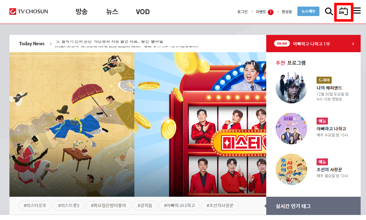 TV조선 홈페이지에 접속해서 우측 상단에 보이는 ON 모양을 클릭하면 TV 조선에서 현재 방송 중인 프로그램을 실시간으로 볼 수 있습니다.