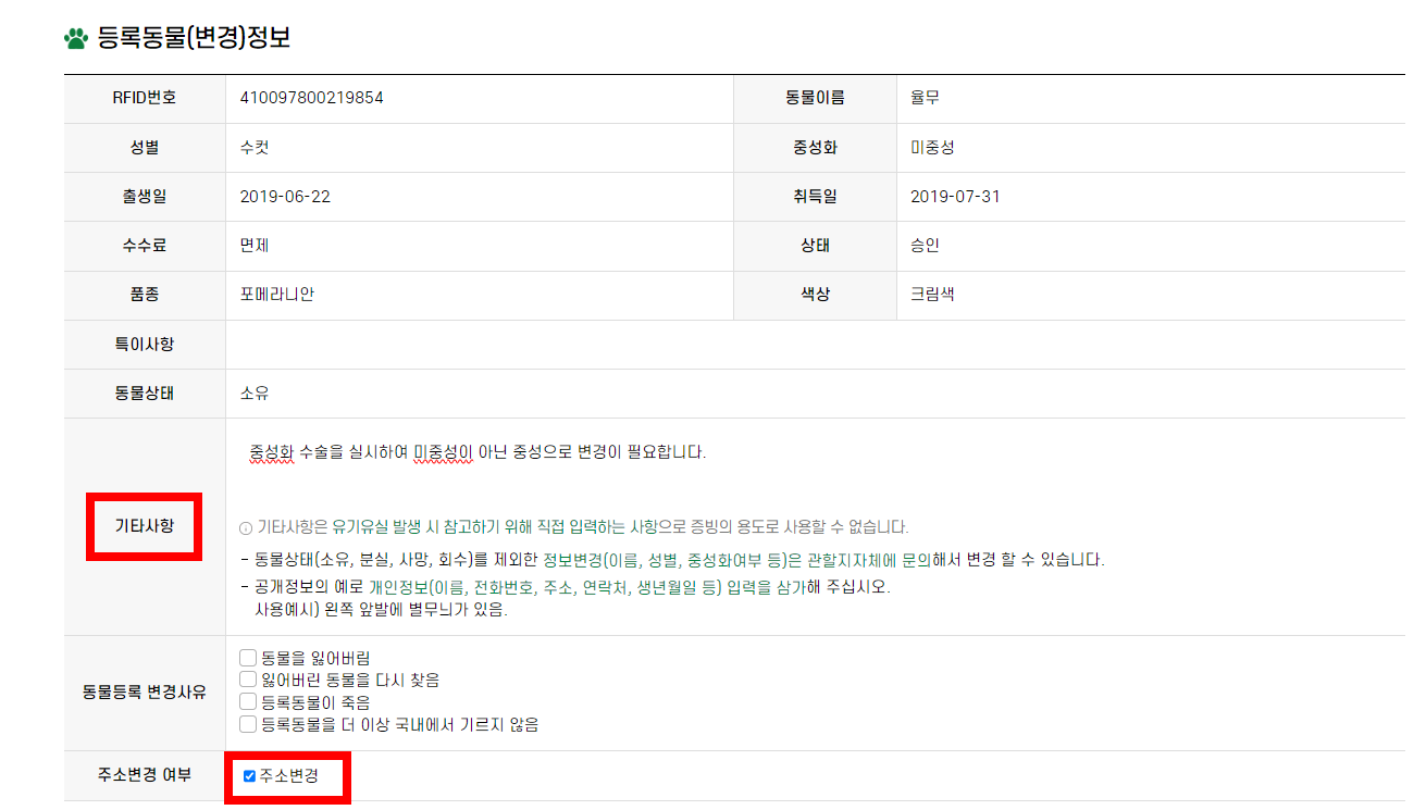 검색을 하고 보니 중성화 유무와 이사로 인해 주소가 변경되어 관할 기관이 변경되었는데 아직 변경이 안되어 있었단 사실을 알게 되었습니다. 포스팅 덕분에 동물등록정보를 변경할 수 있게 되었네요.