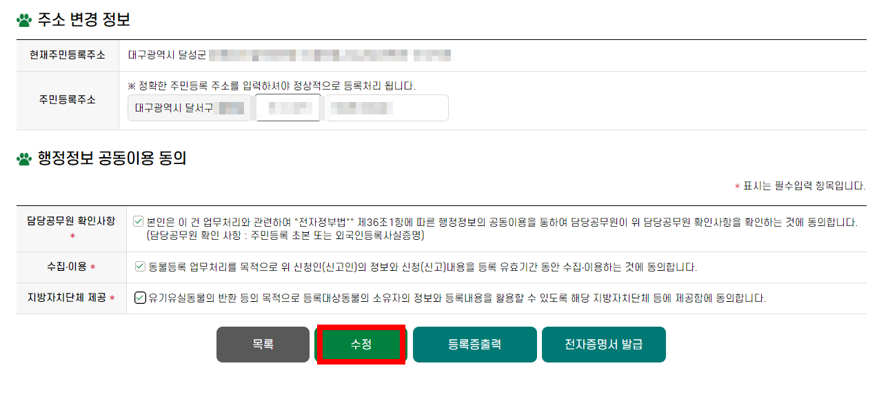 변경된 주소 입력 후 행정정보 공동이용 동의에 동의하시고 수정을 눌러줍니다.
