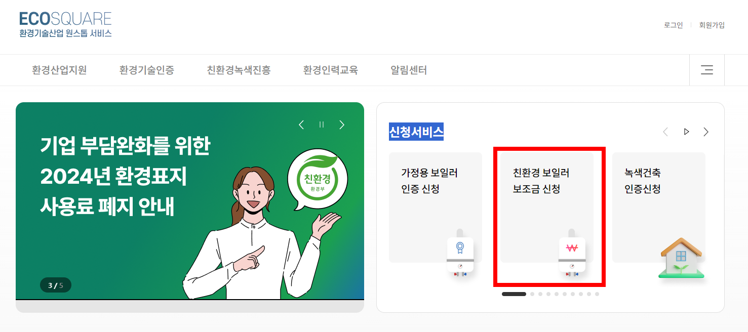 온라인, 오프라인 두 가지 방식으로 신청을 할 수 있습니다. 온라인 신청은 환경부에서 제공하는 '환경기술산업 서비스 에코스퀘어' 홈페이지 회원가입 후 신청하면 됩니다.