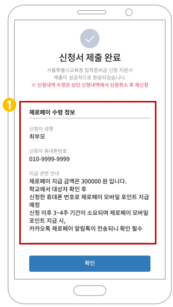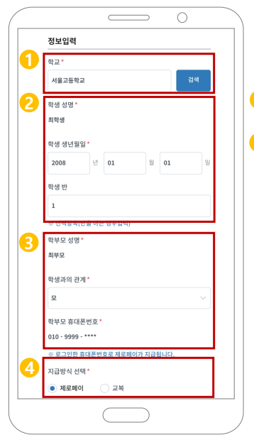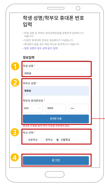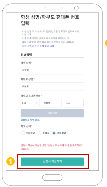 그 다음 학생성명과 학부모 성명 및 휴대전화를 입력합니다.