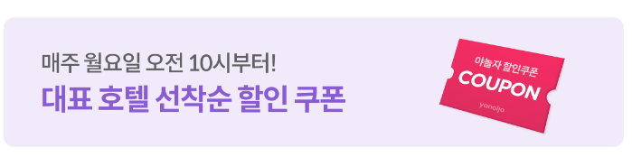 매주 월요일 오전 10시 부터 야놀자 제휴 대표 호텔 선착순 할인 쿠폰을 받을 수 있습니다.