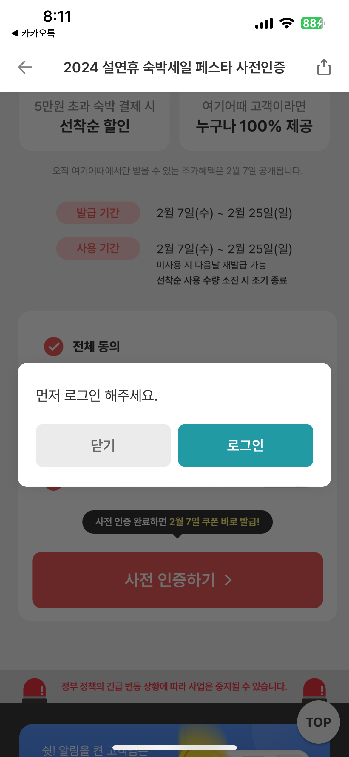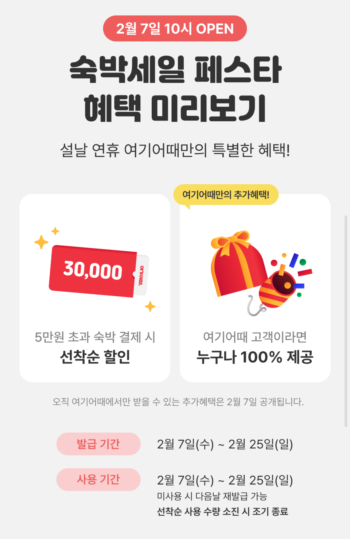 2월 7일 부터 시행하는 어기어때 숙박 세일 페스타 혜택 사전 인증하기를 진행하시면 사전 혜택을 받을 수 있습니다. 2월 휴가 계획이 있으시다면 오늘 사전 인증하시고 혜택도 미리 받아보세요!