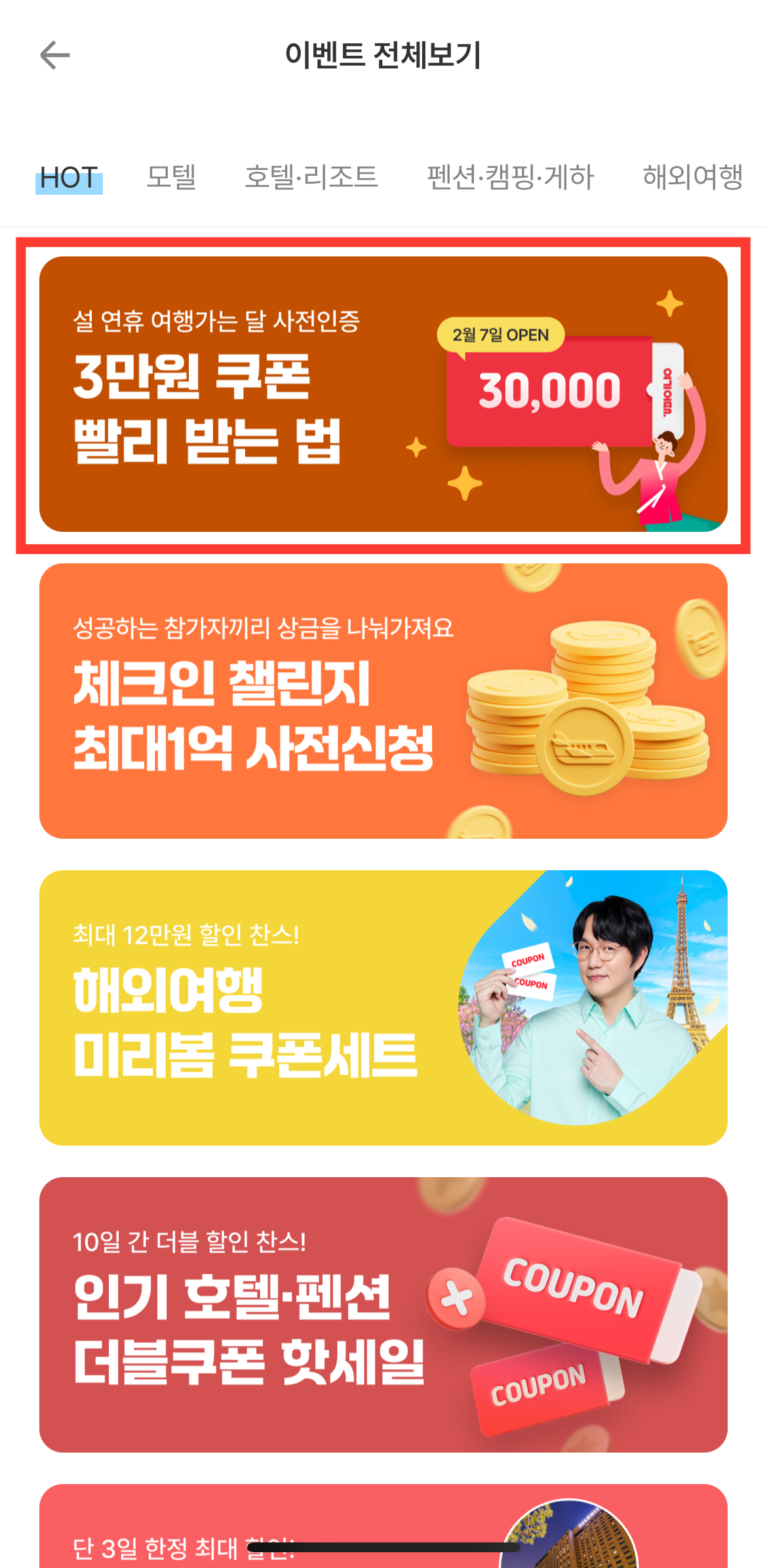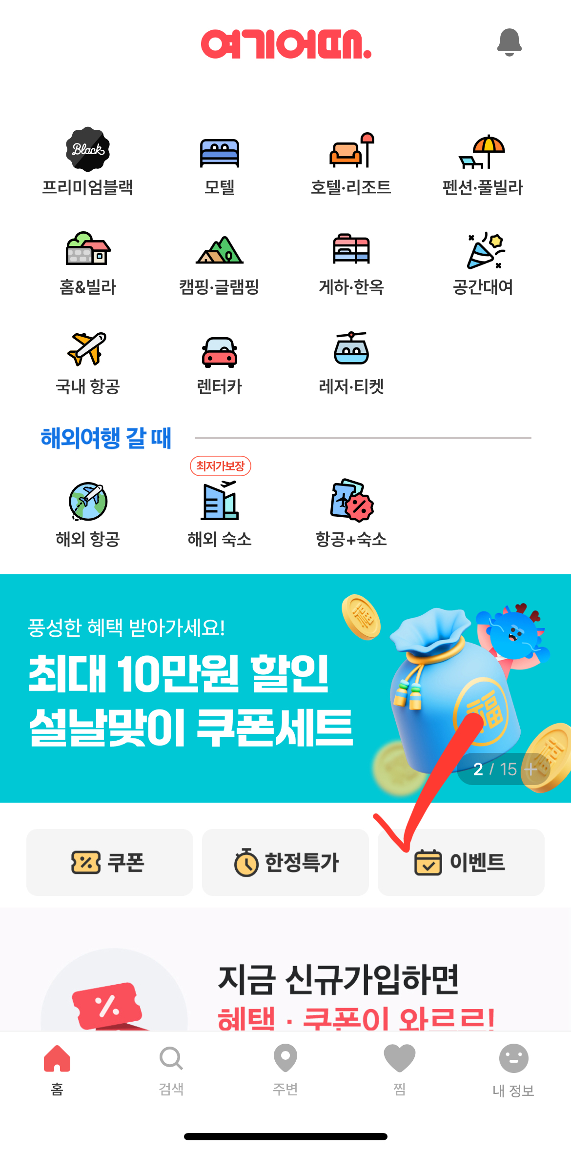 여기어때 어플을 실행하면 '이벤트' 버튼을 클릭해주세요.