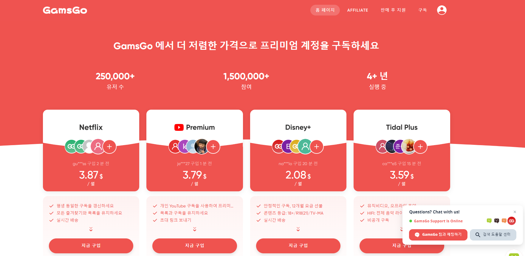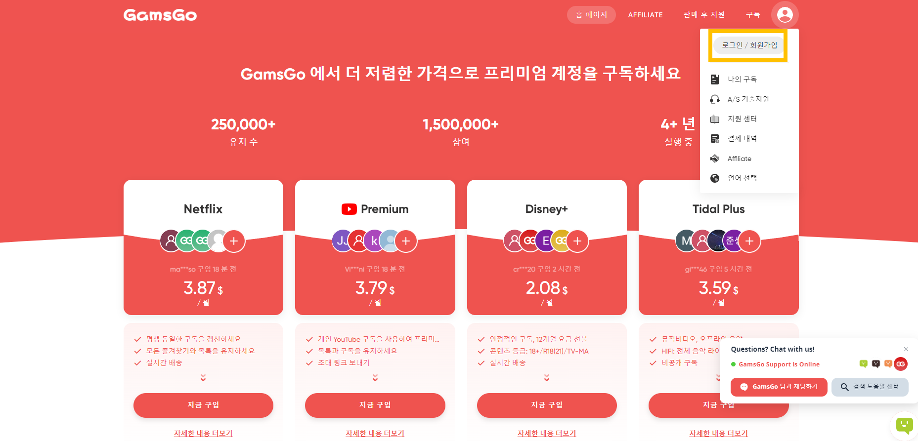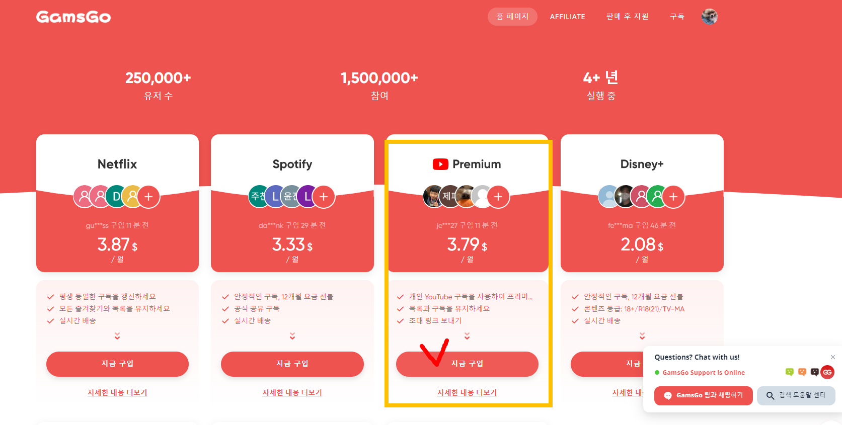 먼저 위의 바로가기 버튼을 클릭해서 GamsGo 사이트로 이동해주세요. 유튜브 뿐만 아니라 넷플릭스, 디즈니 플러스, 스포티파이 등도 저렴한 가격에 구독할 수 있습니다. 방법은 똑같으니 잘 따라해 보세요!!