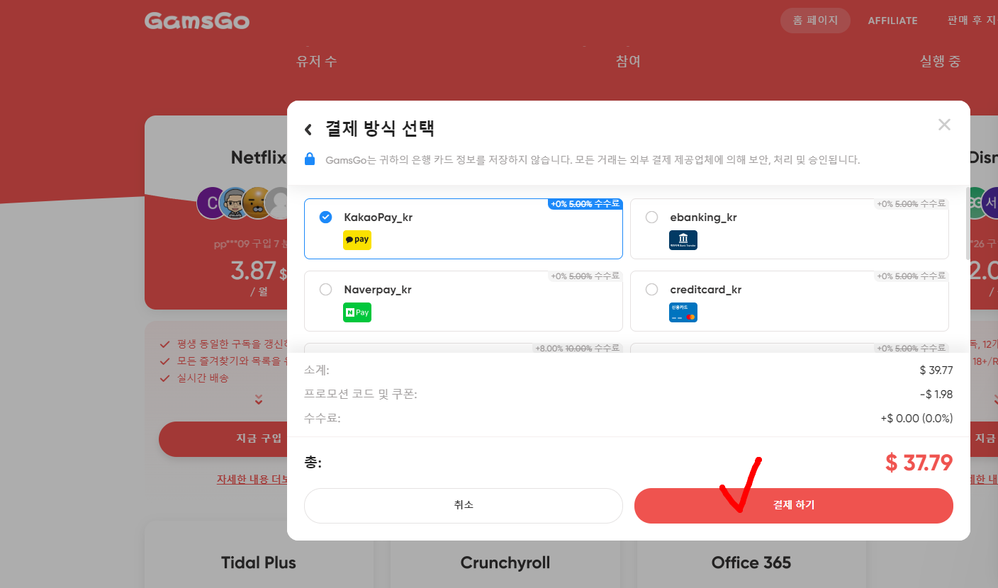 그러면 37.99달러 5만 1460원에 결제가 가능합니다. 결제하기를 클릭하면 결제 화면으로 넘어갑니다.