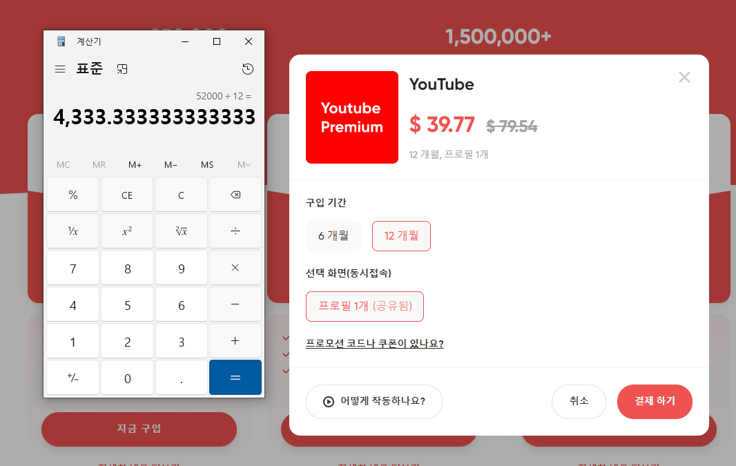 2023년 12월 11일 기준 환율로 봤을 때 12개월 구독시 약 52,000원을 결제하시면 됩니다. 52,000원 나누기 12를 하면 4333원을 한달에 낸다고 생각하시면 됩니다.