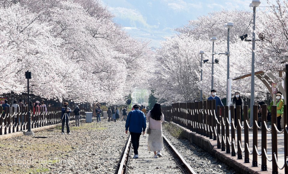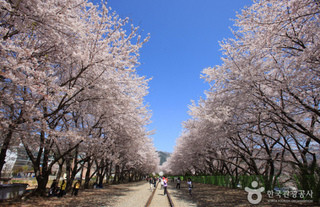 철길 사이에서 연인 또는 가족과 벚꽃을 배경으로 사진을 찍을 수 있고
