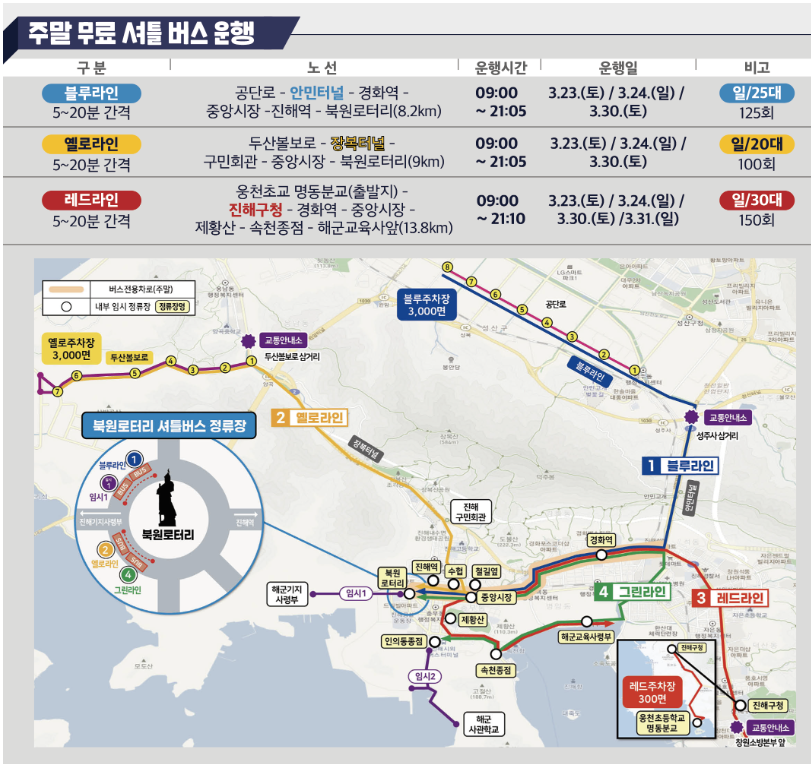 진해 군항제의 원활한 진행을 위해 단체 관광객들에게 무료 셔틀 버스를 운행하고 있습니다. 배차 간격은 5~20분으로 블루라인, 옐로라인, 레드라인으로 총 3개 노선을 운행합니다.
