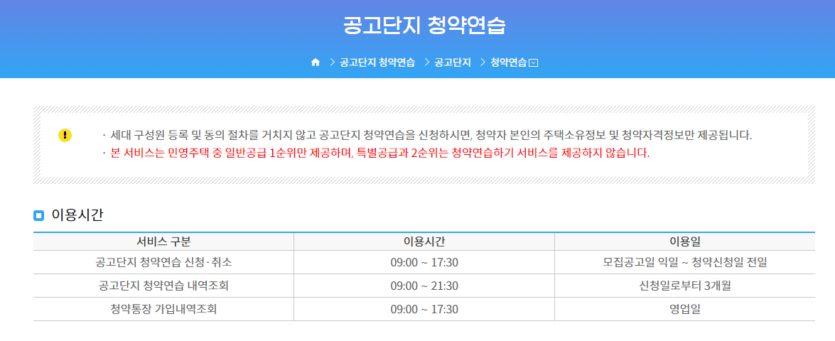 : 청약홈 홈페이지에서는 모집공고 단지의 청약연습을 할 수 있습니다. 청약연습은 실제 청약신청과 동일한 절차를 거치지만 청약금을 납부하지 않고 당첨여부도 확인할 수 없습니다.